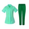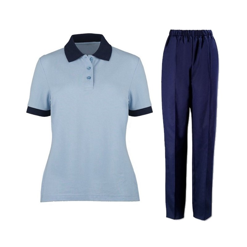 Pale blue polo shirt with navy trim and navy trousers Tunic option available