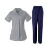 Pale blue with white trim, navy trousers